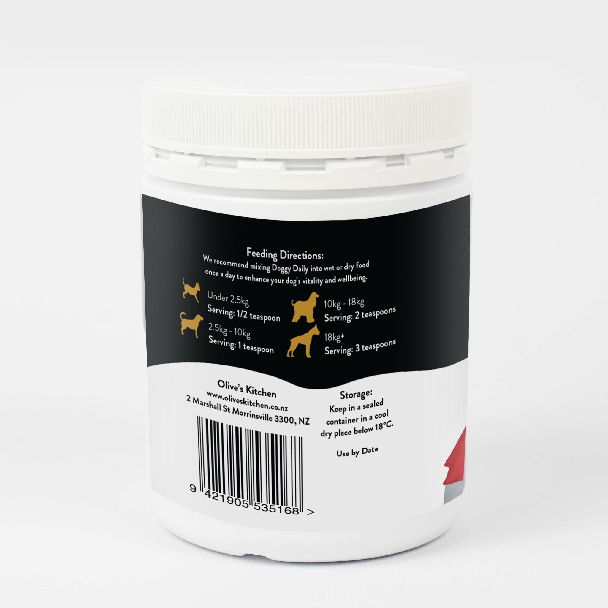 At Olive's Kitchen, we are committed to promoting your dog's wellness through the natural supplement, Doggy Daily. Our product is designed to support gut health and improve overall well-being, with many of our customers experiencing outstanding results by adding this supplement to their dog's meals.