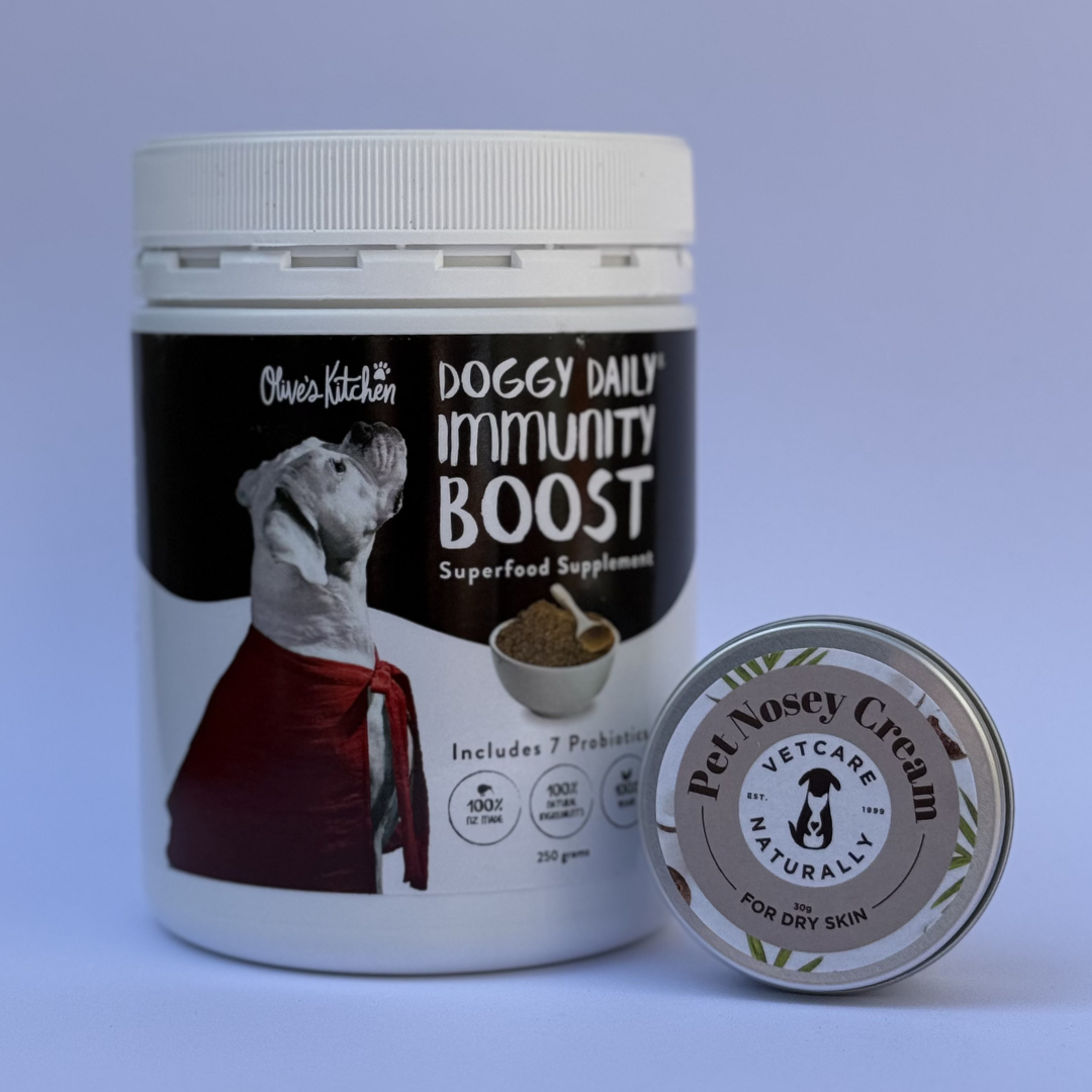 Perfect for dogs of all sizes, this bundle helps maintain digestion, immunity, skin health, and provides soothing care for dry or sensitive noses.