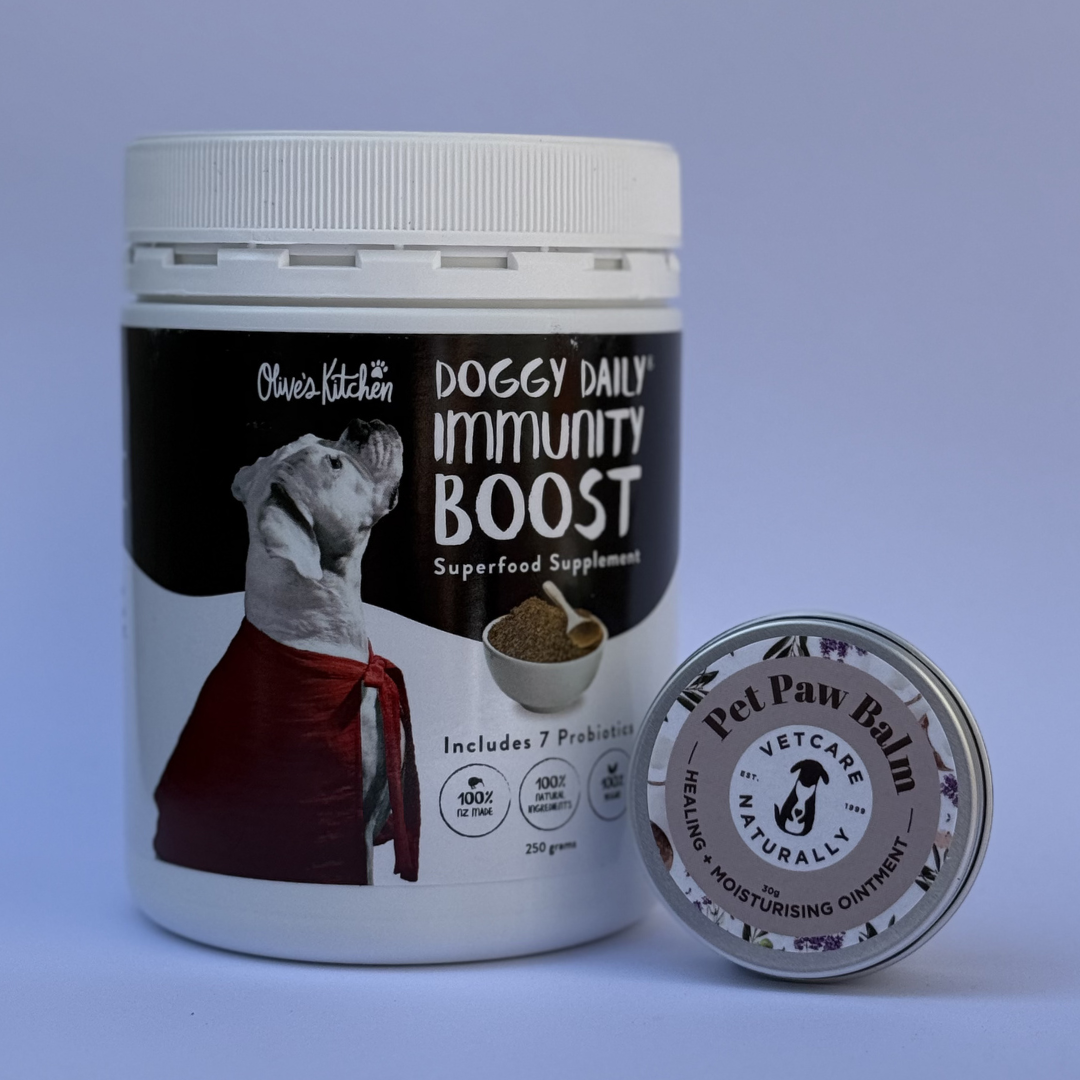 Perfect for dogs of all sizes, this bundle helps maintain digestion, immunity, skin health, and provides soothing care for dry or cracked paws.